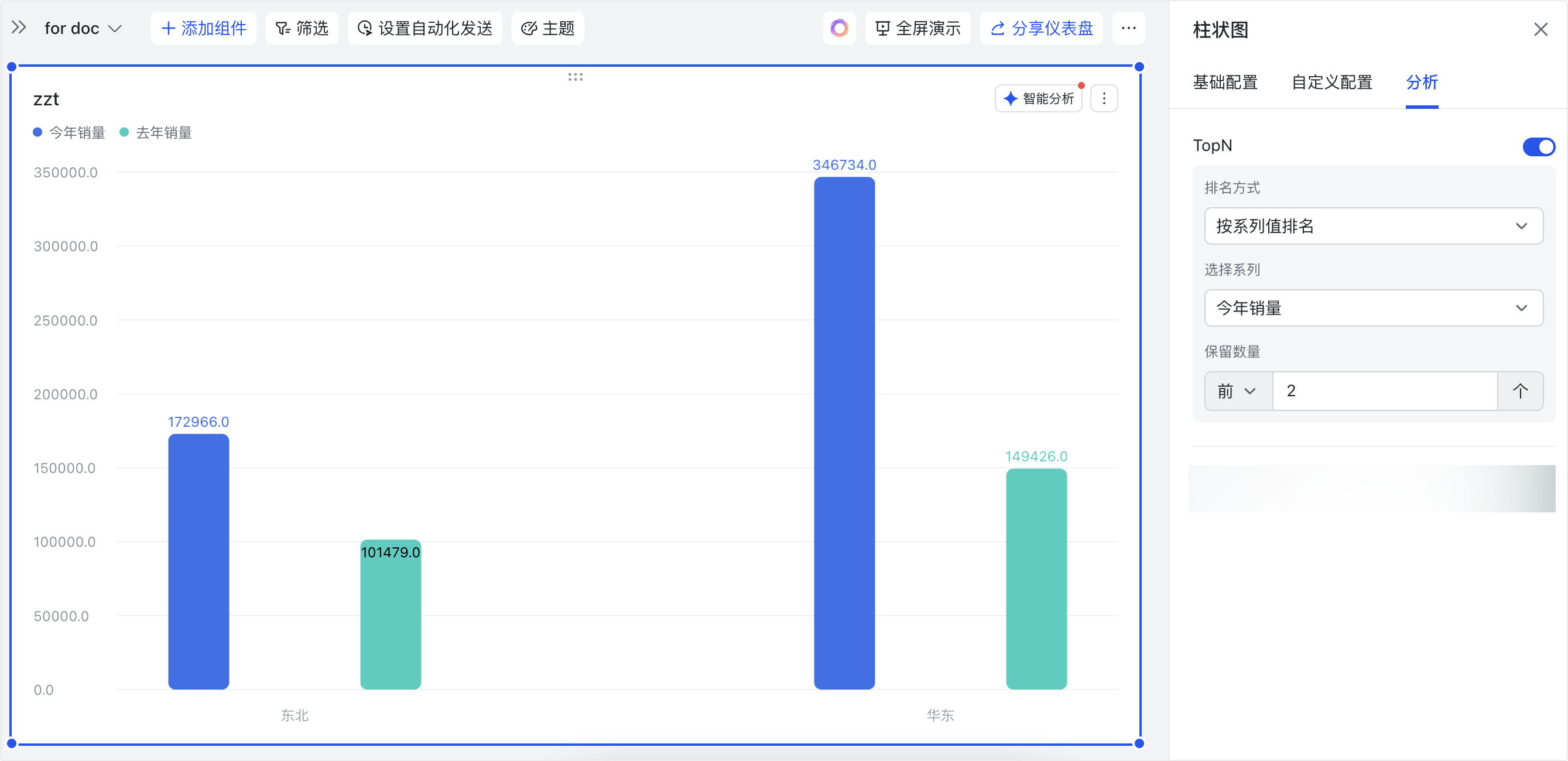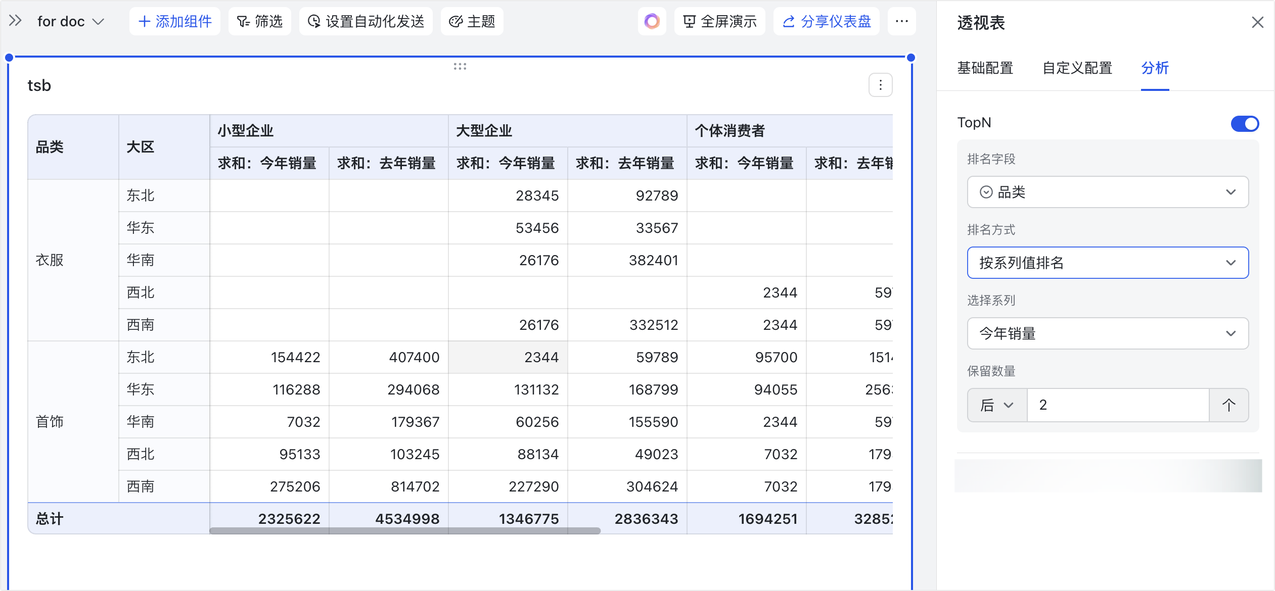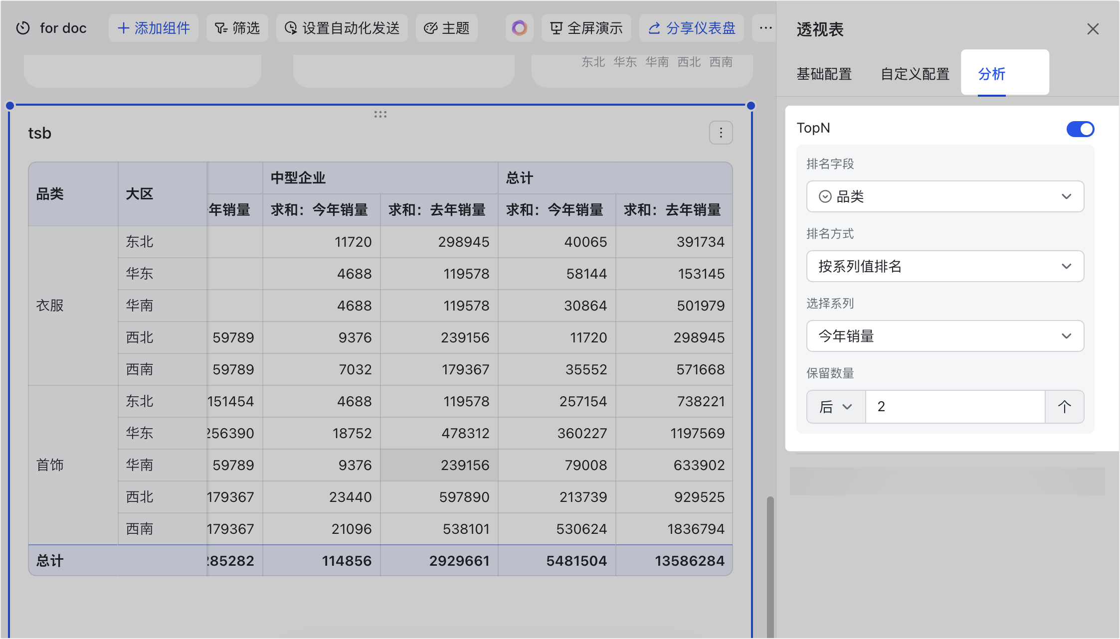 - 应用场景示例:以下图配置为例,可以分析出今年销量(系列)最高的 2 个大区(类别)。