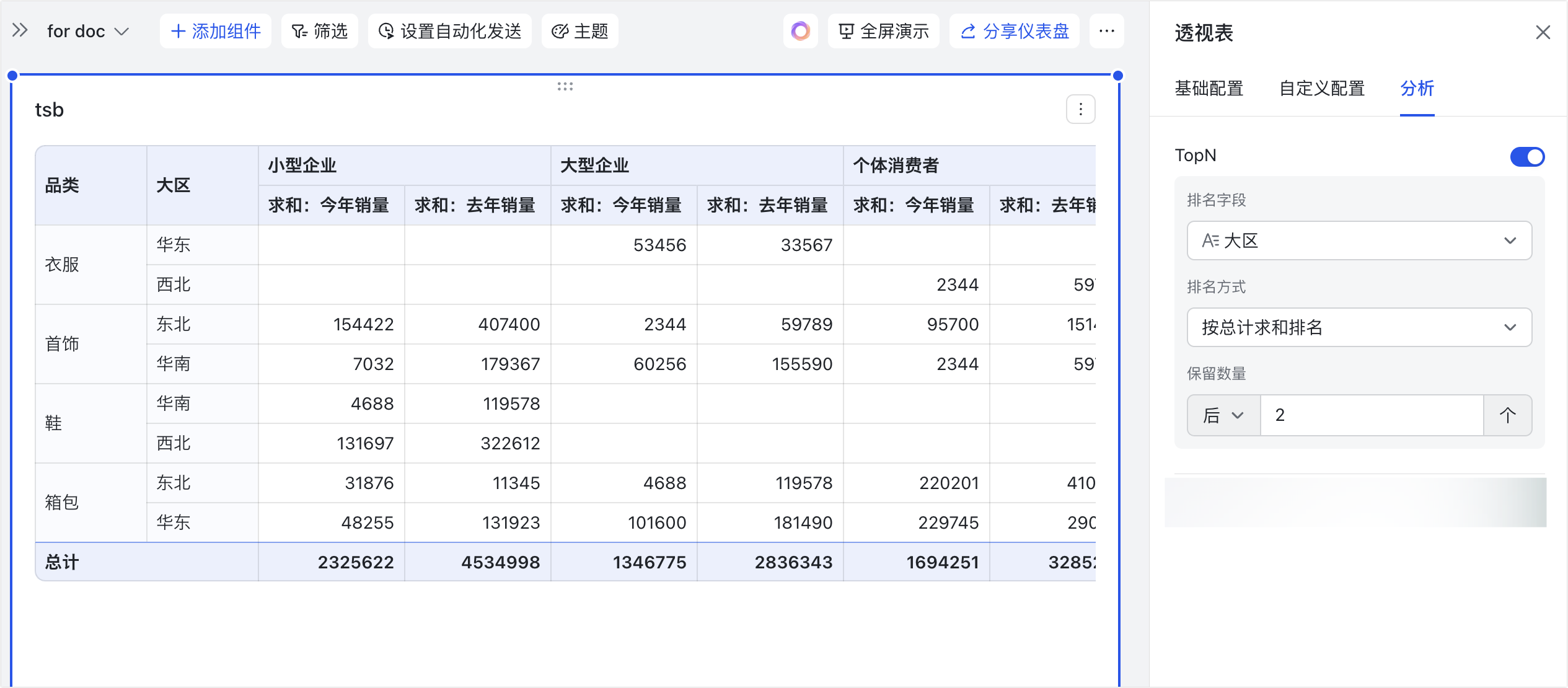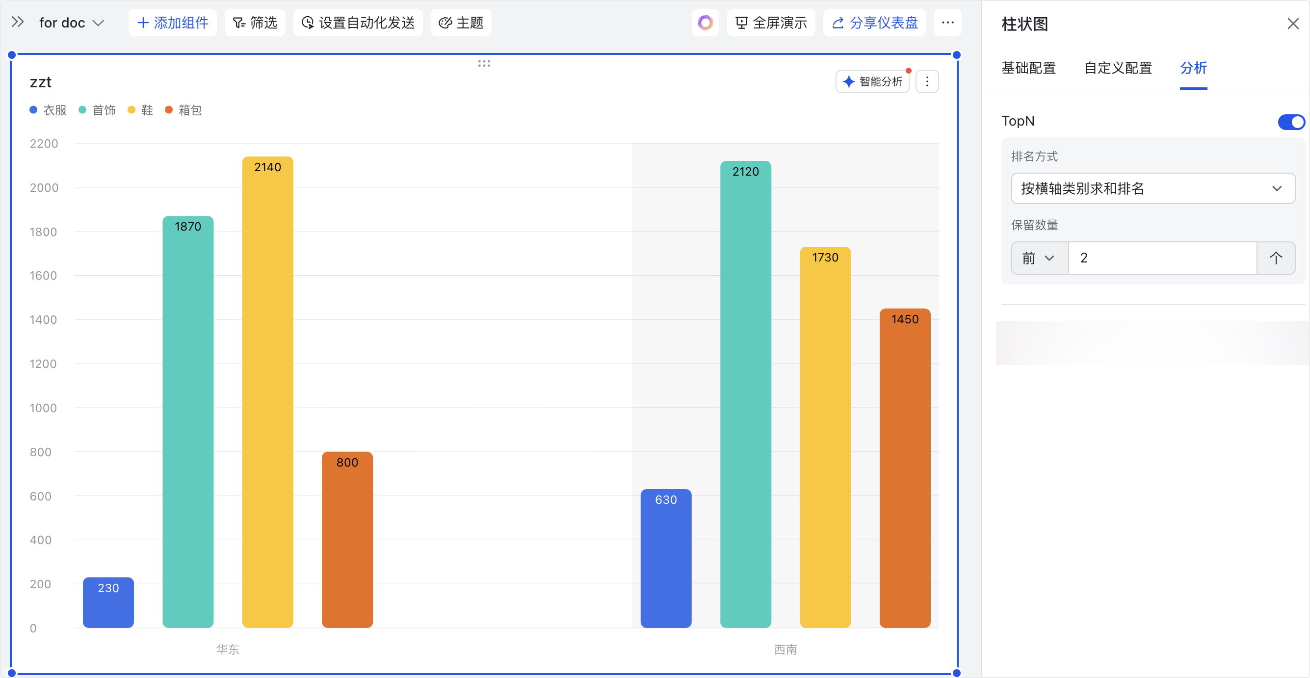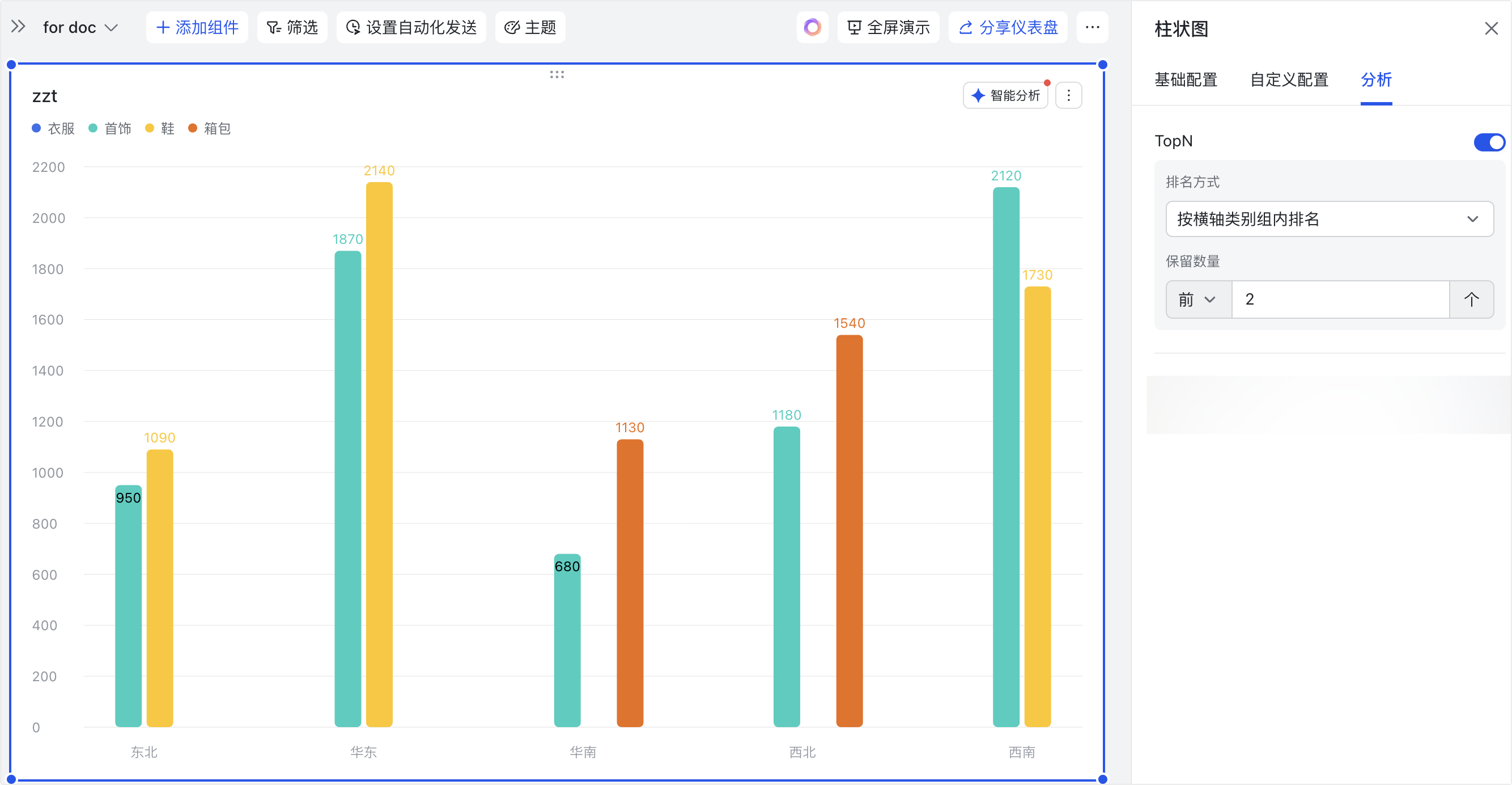 - 应用场景示例:以下图配置为例,可以分析衣服、首饰、鞋、箱包这四个系列在各个大区(类别)的销量总和,并展示销量总和最高的 2 个大区。