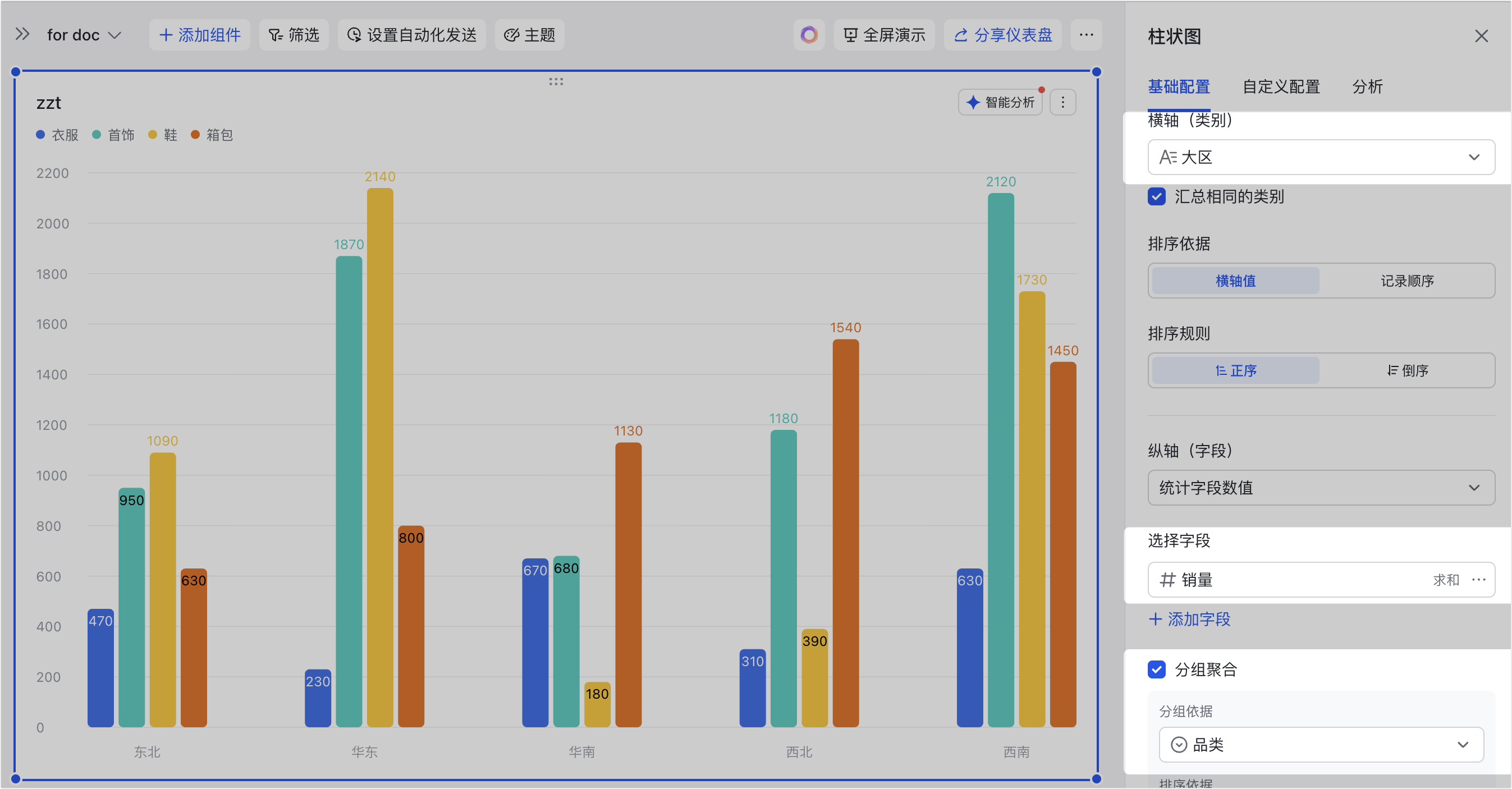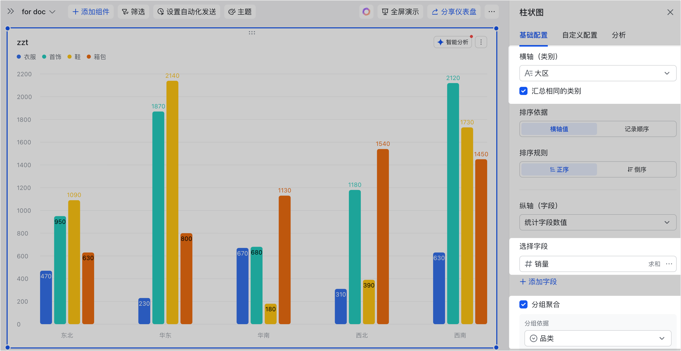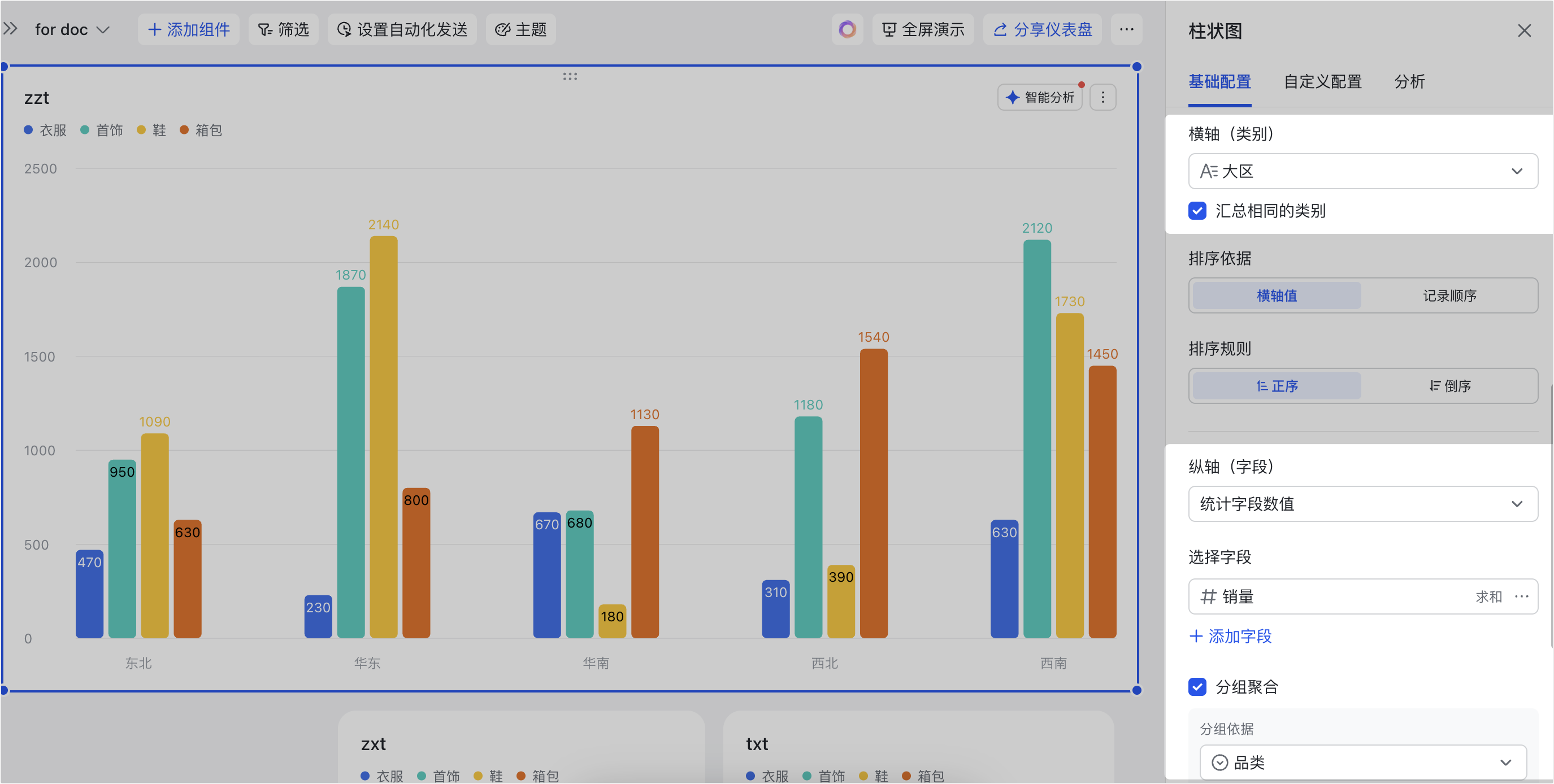 - 应用场景示例:以下图配置为例,可以分析衣服、首饰、鞋、箱包这四个系列在各个大区(类别)的销量总和,并展示销量总和最高的 2 个大区。