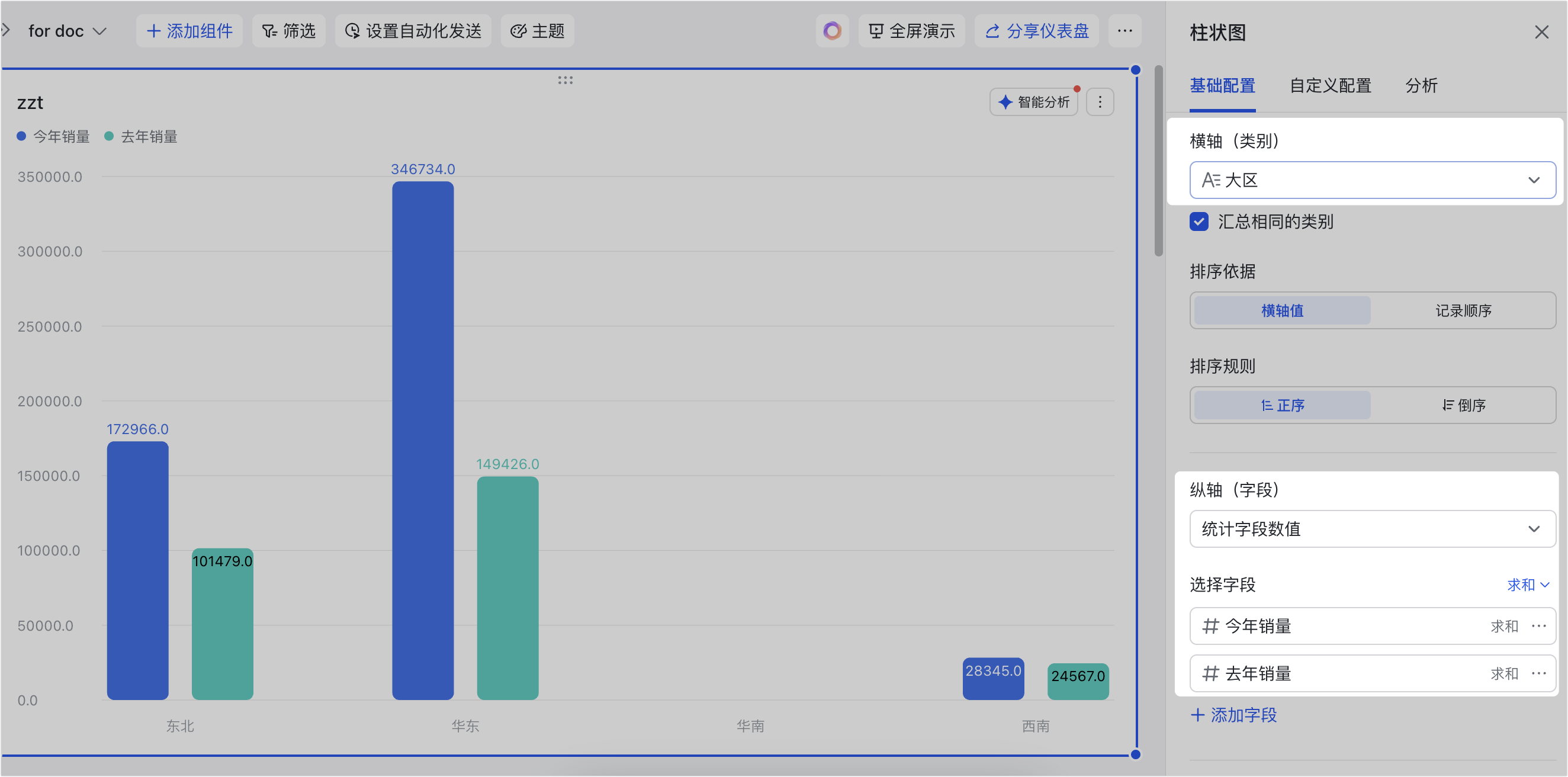 - 使用前提:需在图表 基础配置 页签中的 纵轴(字段) 或 横轴(字段) 或 数值轴(系列) 中至少选择 2 个字段,或者启用 分组聚合。