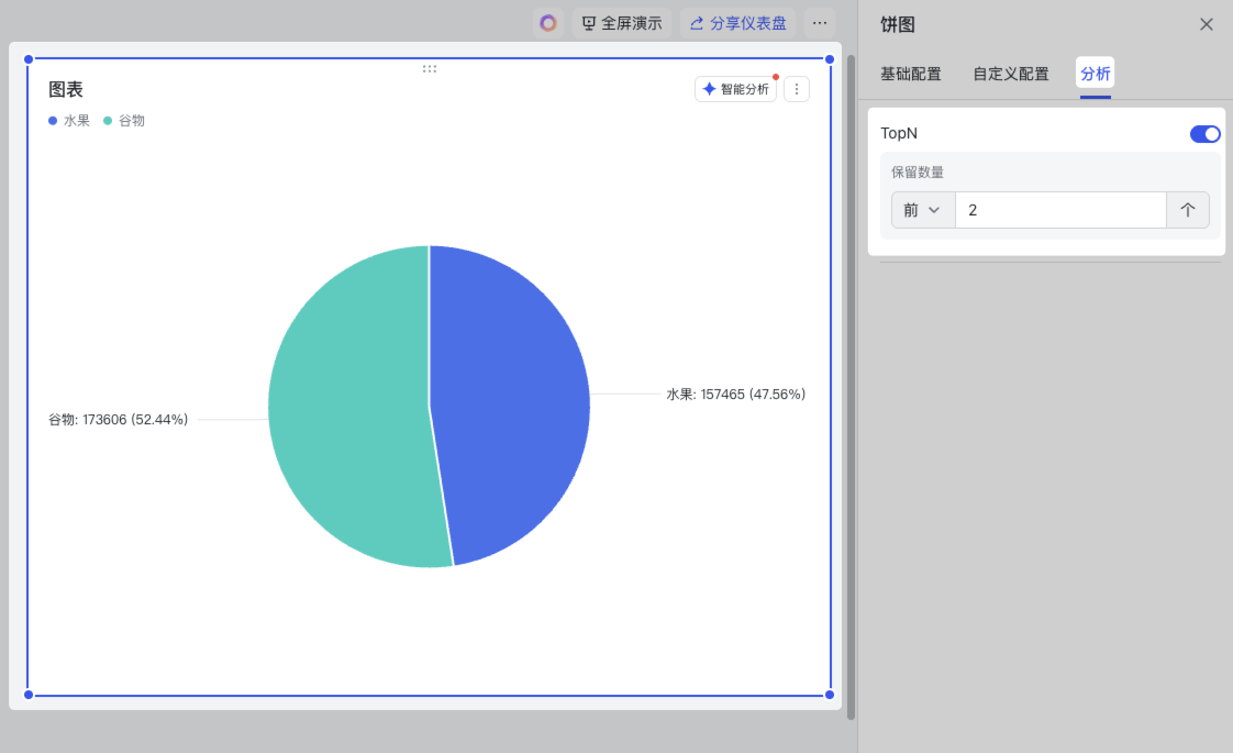 在饼图和环形图中,默认按照 扇区数值 从大到小排名,不支持设置其他的排名方式。结合 保留数量 可以分析出数值最大或最小的几个扇区。 以下图配置为例,可以分析出销售量排名前 2 的商品种类。